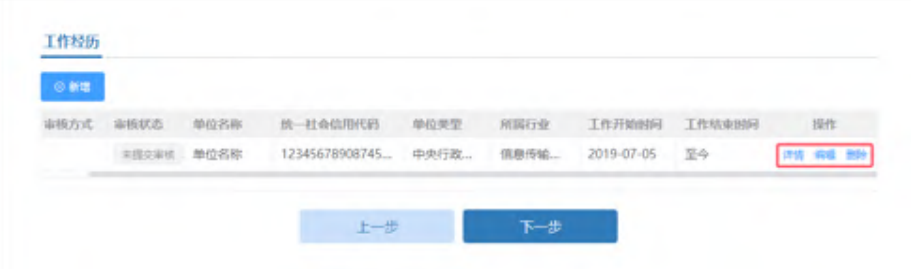 在填写完工作经历信息后页面表格会回显填写完的信息,可以进行查看详情、编辑以及删除操作。如下图所示: