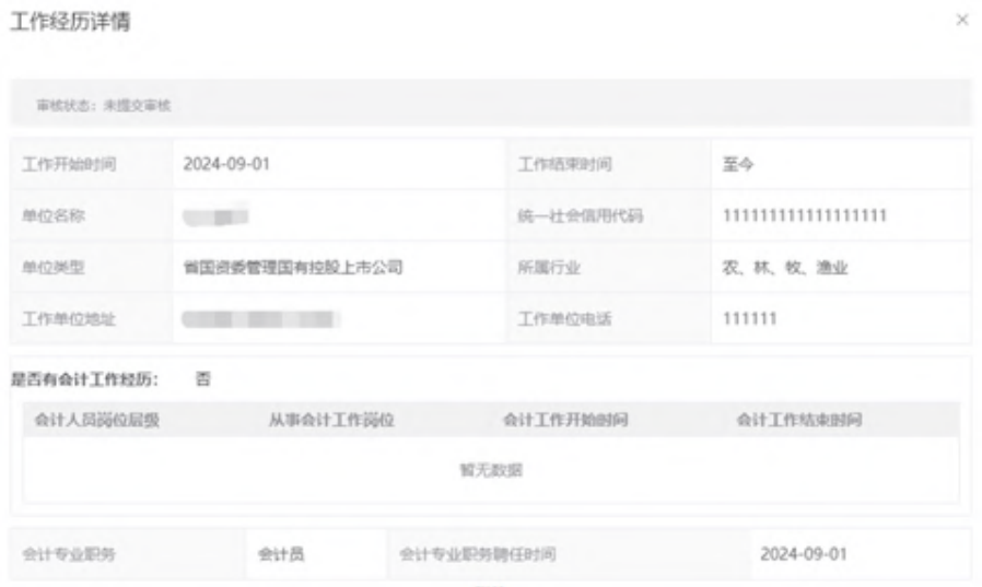(2)选择“不从事第(一)项所列具体会计工作但具有会计专业技术资格的人员”,系统会从全国会计资格职称库进行核验(2001 年之后的证书数据),核验通过后,后台会标注已核验全国证书库。