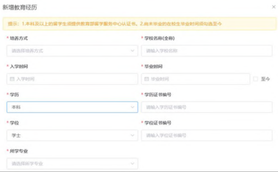 点击新增进行教育经历的信息采集。新增教育经历弹窗包括培养方式、学校名称、学历、学位(填写已取得证书的学历、学位)、所学专业、入学时间、毕业时间、学历证书编号、学位证书编号以及根据所填信息上传必要的附件(如下图)。教育经历附件要求大专以下学历上传学历证书,大专及以上学历、学位首次提交与学信网进行自动核验,核验不通过的需要上传对应的学历、学位证书信息。其中本科及以上的留学生须提供教育部留学服务中心认证书。尚未毕业的在校生毕业时间须勾选至今。