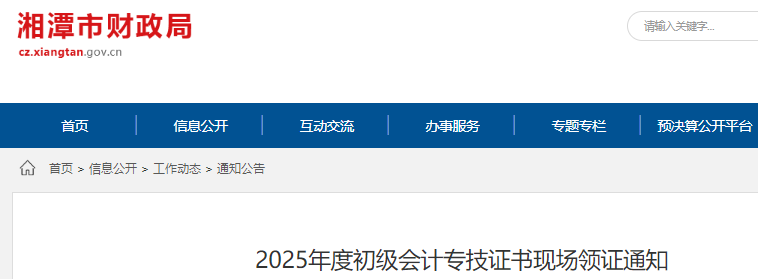 11月14日,湘潭市财政局发布了《关于2025年度初级会计专业技术资格证书现场领证的通知》,其中明确2025年初级会计证书现场领取时间为11月14日起至2026年6月30日,领证人员必须先在网上申请并填写相关信息方可领证。