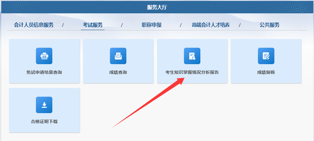 第二步:点击【服务大厅】栏目的【考试服务】板块,选择“考生知识掌握情况分析报告: