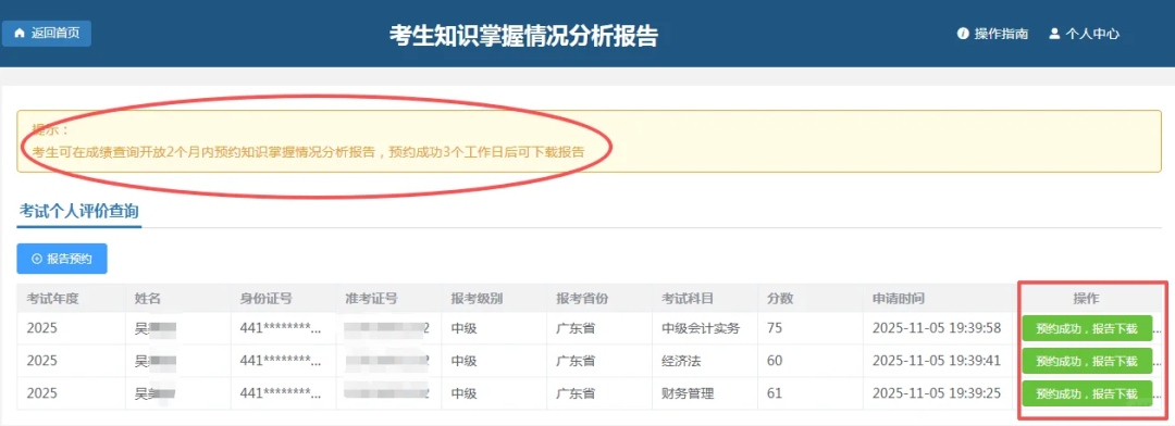 日前发现,在全国会计人员统一服务管理平台中增加了下载考生知识掌握情况分析报告的模块入口,2025年中级考生可以自行登录账号预约下载专属考试分析报告。