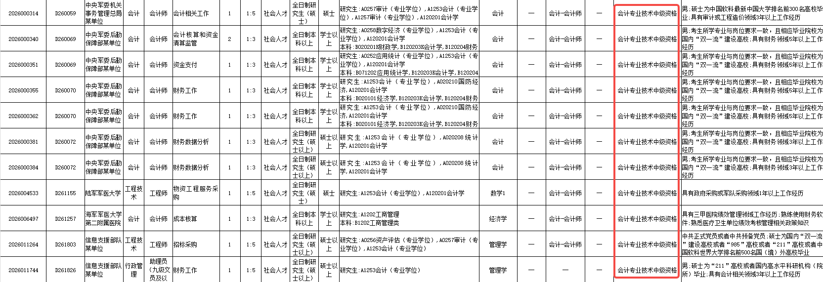 小编发现在此次招考计划中还有不少会计岗位,应届生和社会人士都能报名,但是大部分都要求具有中级会计职称。