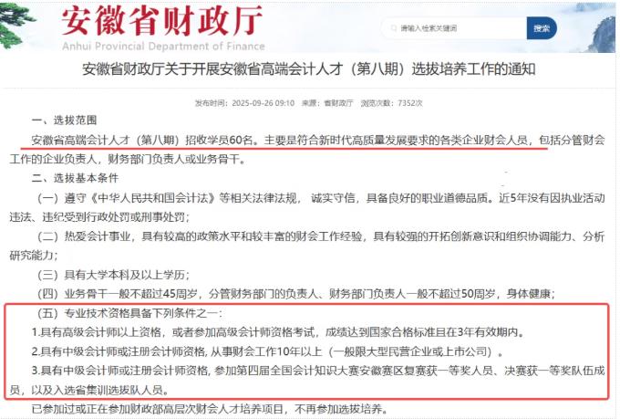 在安徽省财政厅发布的高端人才选拔培养通知中:明确招收学员60名,选拔条件中提到有中级会计师资格,从事财会工作10年以上。