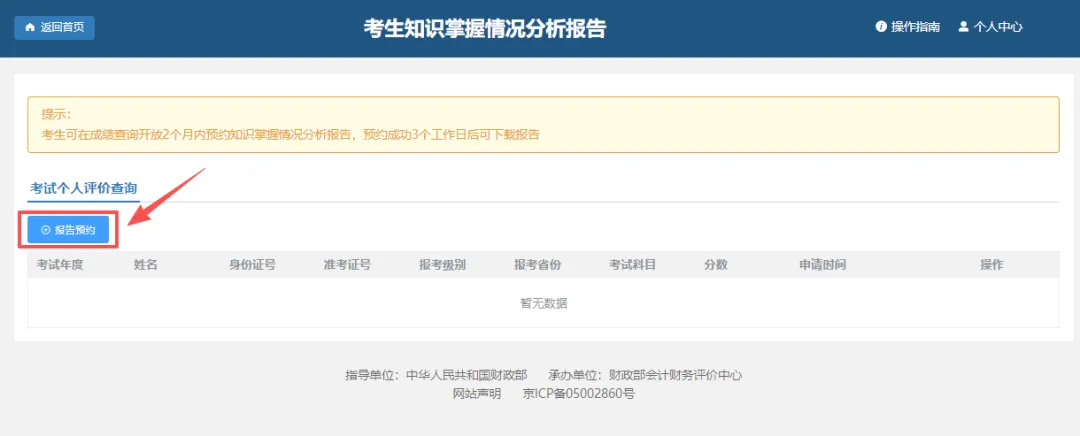 第三步:点击【考生知识掌握情况分析报告】,进入后点击【报告预约】。