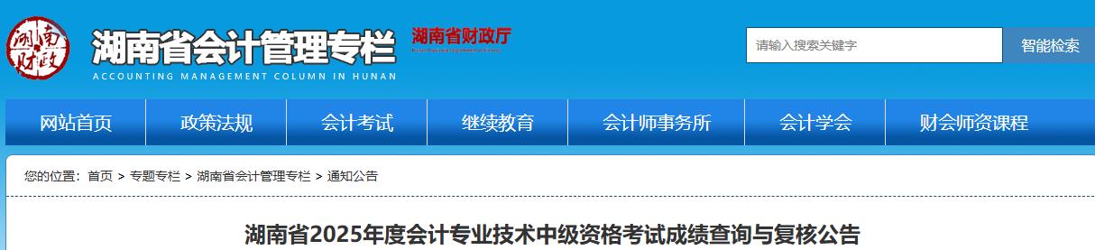湖南省2025年度会计专业技术中级资格考试成绩查询与复核公告