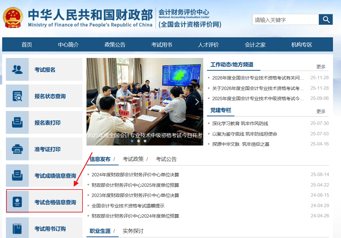 第一步:登录“全国会计资格评价网”,点击左侧“考试合格信息查询”