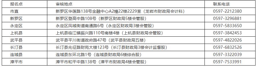市直考生请于2025年11月11日至11月12日(上午 8:30-11:30,下午3:00-5:00)到新罗区华莲路138号金融中心A2幢2229室(市财政局会计科)审核。会计科业务咨询电话:0597-2212380。
