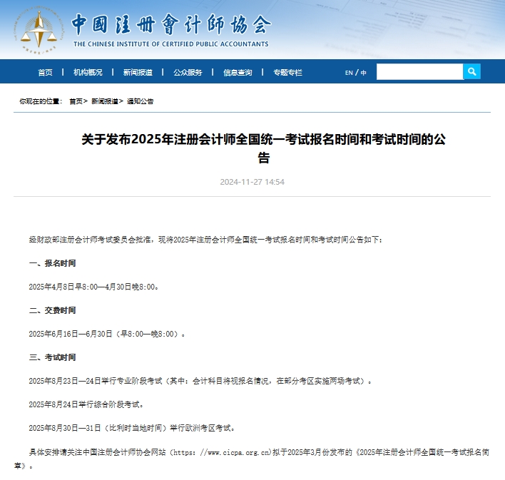 以下是2025年注册会计师报名时间通知: