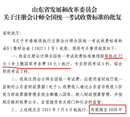 2026年山东注册会计师报名费是每科次75元,综合阶段考试按两科计。如下图: