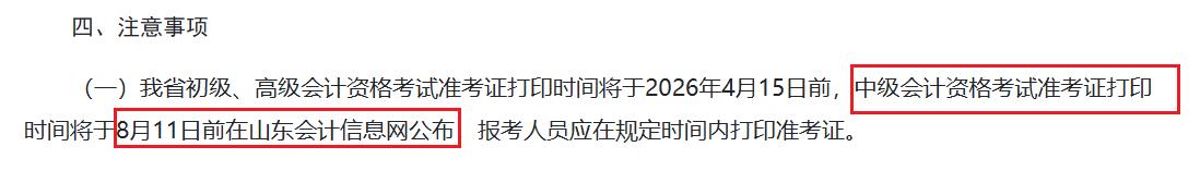 根据山东会计信息网发布的《山东省财政厅 山东省人力资源和社会保障厅关于做好2026年度全国会计专业技术资格考试报名工作的通知》可知:中级会计资格考试准考证打印时间将于8月11日前在山东会计信息网公布,报考人员应在规定时间内打印准考证。