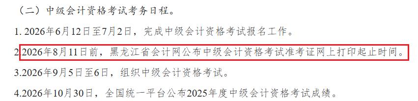 根据黑龙江省财政厅发布的《关于2026年度全国会计专业技术资格考试黑龙江考区有关事项的通知》可知:2026年8月11日前,黑龙江省会计网公布中级会计资格考试准考证网上打印起止时间。