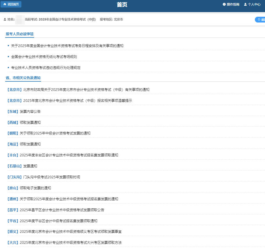 5. 完成阅读须知后,进入到所选择省份设置的通知公告页面,包括报考人员必读事项以及省、市相关公告及通知。点击【已阅读并知晓】。