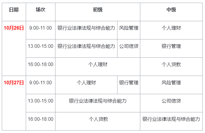 在2024年下半年银行从业资格考试在10月26日至27日举行,每个阶段为期两天。考试将涵盖初级和中级两个层级,且两个阶段的考试科目时间表完全相同,以确保所有考生都能在相同的条件下参加考试。