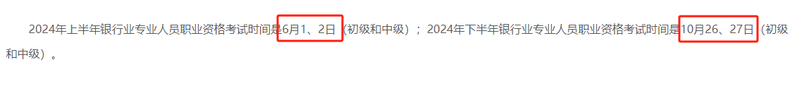 根据中国银行业协会发布的《关于2024年度银行业专业人员职业资格考试时间的公告》,其中明确了2024年银行从业资格考试时间,上半年考试时间为6月1、2日;下半年考试时间为10月26、27日。