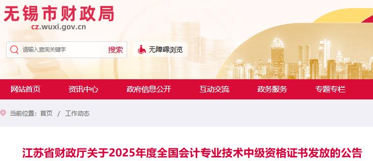 江苏省财政厅关于2025年度全国会计专业技术中级资格证书发放的公告