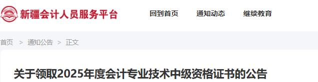 新疆会计人员服务平台发布了《关于领取2025年度会计专业技术中级资格证书的公告》公告中明确了2025年新疆地区中级会计合格证书及登记表将于2026年2月25日开始领取。