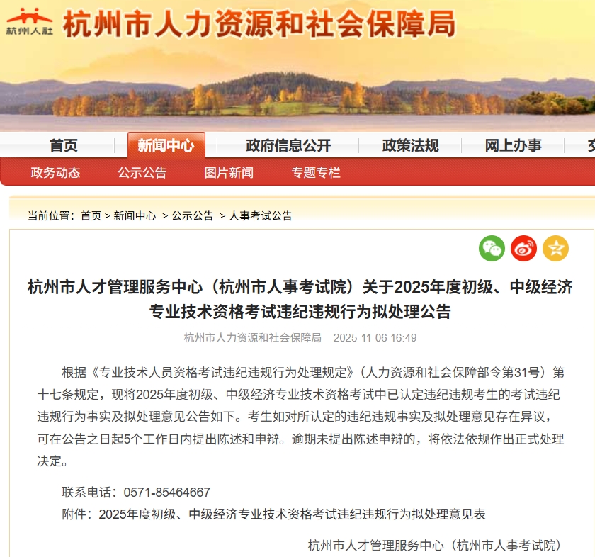 2025年11月6日,杭州市人才管理服务中心发布公告,3名考生被处理: