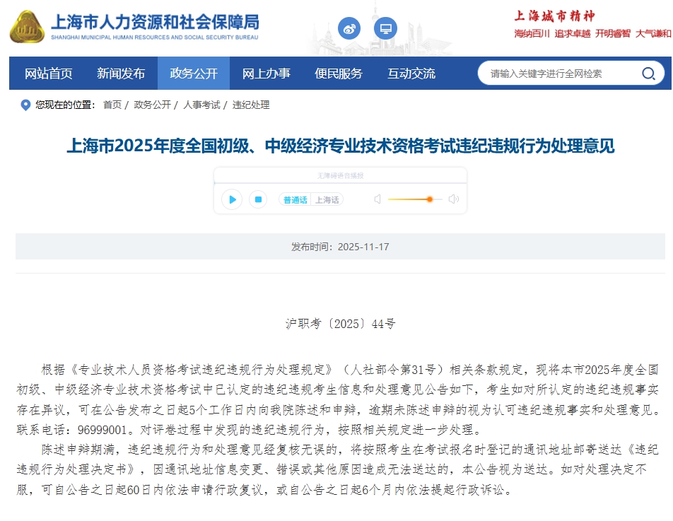 2025年11月17日,上海市职业能力考试院发布处理意见,6名考生被处理: