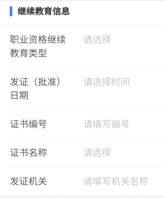 确认个人信息无误后,选择“职业资格继续教育”作为继续教育类型,并填写相关信息,包括证书名称、发证日期、证书编号和发证机关。