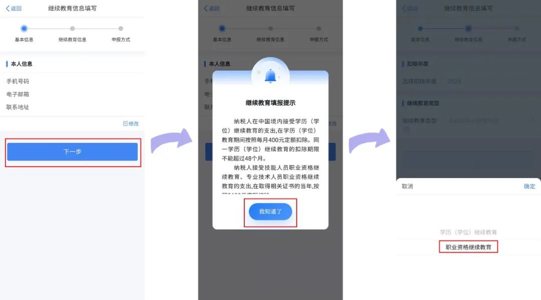 选择“继续教育”,并根据需要选择扣除年度,注意扣除年度应为证书上的批准日期所在年。