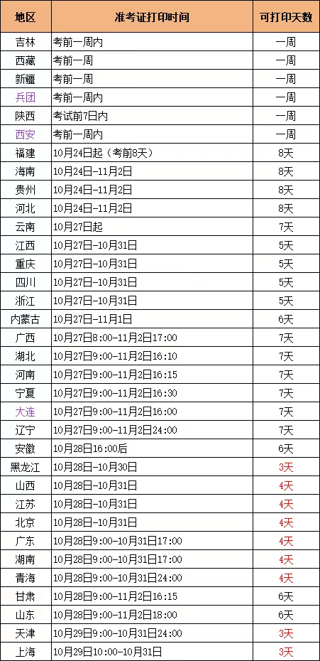 准考证打印时间如下: