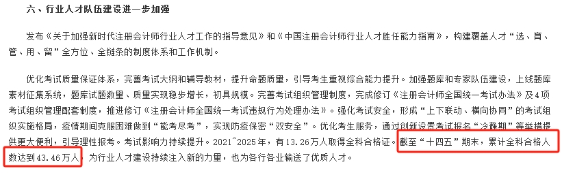 根据中国注册会计师协会发布的《注册会计师行业“十四五”规划实施评估报告》,截至“十四五”期末,注册会计师共有从业人员40余万人,注会全科合格人数达到434600余人,为行业人才建设持续注入新的力量,也为各行各业输送了优质人才。