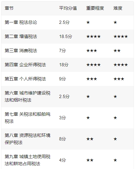 以上分值为近三年平均分值,实际考试中各章节分值可能会有一定波动。建议考生在备考时重点关注增值税、企业所得税、个人所得税、土地增值税等核心税种,同时兼顾其他章节的基础知识点。
