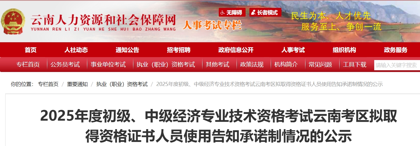 2025年度初级、中级经济专业技术资格考试云南考区拟取得资格证书人员使用告知承诺制情况的公示
