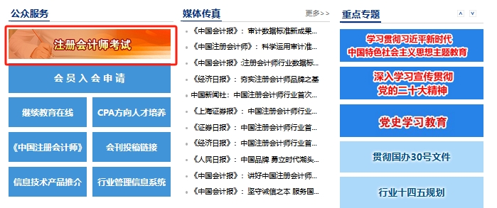 2、在官网首页找到“注册会计师考试”一栏,点击进入;