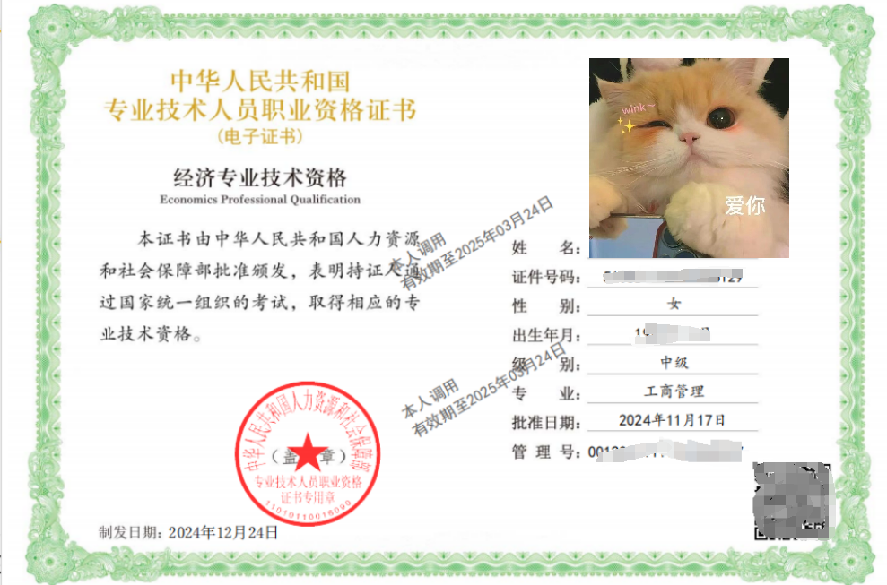 自2021年12月17日起,经济专业技术资格等24项由部委批准颁发证书的专业技术人员职业资格使用"中华人民共和国人力资源和社会保障部专业技术人员职业资格证书专用章"电子印章制发电子证书。