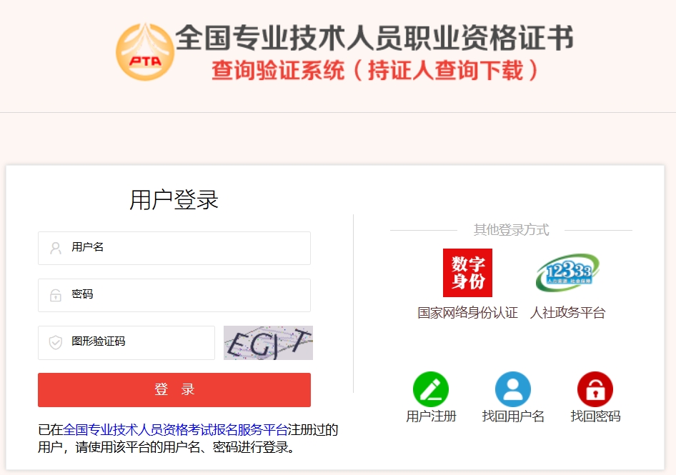 访问中国人事考试网官网(www.cpta.com.cn),点击首页左侧的"电子证书下载"栏目。已在中国人事考试网注册过的考生,可直接使用用户名和密码登录;未注册的考生需先完成实名注册,使用取得证书时所用证件的证件号码进行注册。