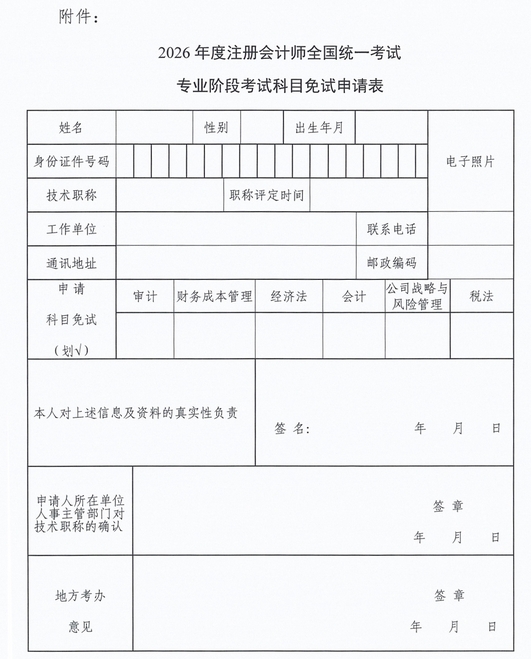 (一)《2026年度注册会计师全国统一考试专业阶段考试科目免试申请表》(一式两份,见附件);