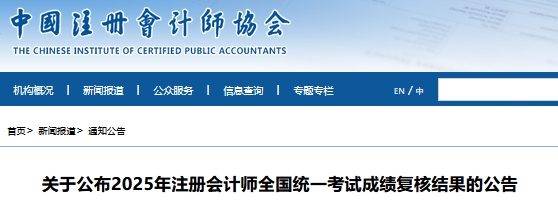2026年1月23日,中国注册会计师协会发布了《关于公布2025年注册会计师全国统一考试成绩复核结果的公告》,将成绩复核结果进行公布,考生登录“注册会计师全国统一考试网上报名”系统查询本人2025年注册会计师全国统一考试成绩复核结果。