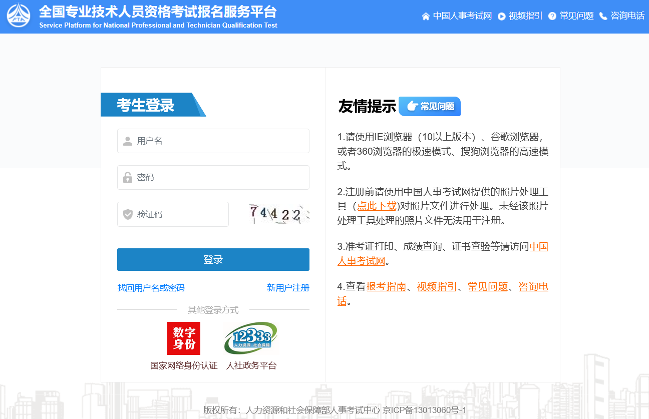 ①进入中国人事考试网“网上报名”入口后,点击【新用户注册】按钮,进行注册。(也可以注册人社政务平台的账号)