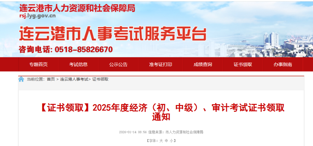 2026年1月30日前,2025年江苏连云港中级经济师证书需完成领取,考生可选择网上申请邮寄或现场领取。邮寄需登录江苏省人事考试平台办理,到付寄送;现场领取须本人或代领人携带双方身份证,在规定时间内前往指定地点办理。