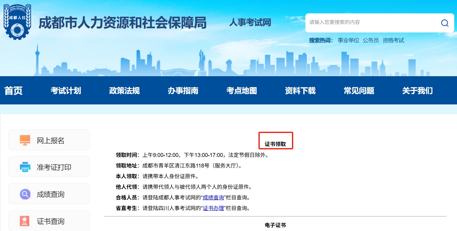 | 异地/工作忙不便到场 | 证书邮寄 | 在成都人事考试网“证书邮寄”栏目申请 | 临近用证才申请,可能赶不上时间 |