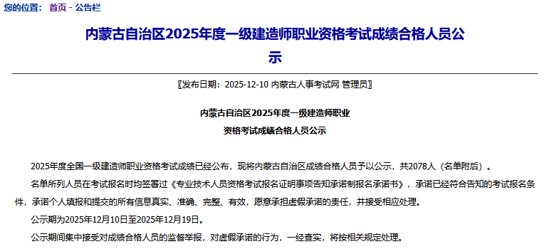 12月10日,内蒙古人事考试网发布2025年一级建造师考试合格人员公示名单,全省共2078人合格。相比去年全省合格人数上涨22.38%,增加380人。公告原文截图如下: