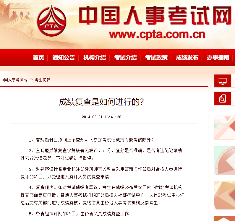 3、复查程序。如对考试成绩有异议,考生在成绩公布后30日内向当地考试机构提交书面复查申请,各地人事考试机构汇总后报人社部考试中心,人社部考试中心汇总后交有关部门进行成绩复核,复核结果由各地人事考试机构反馈考生。