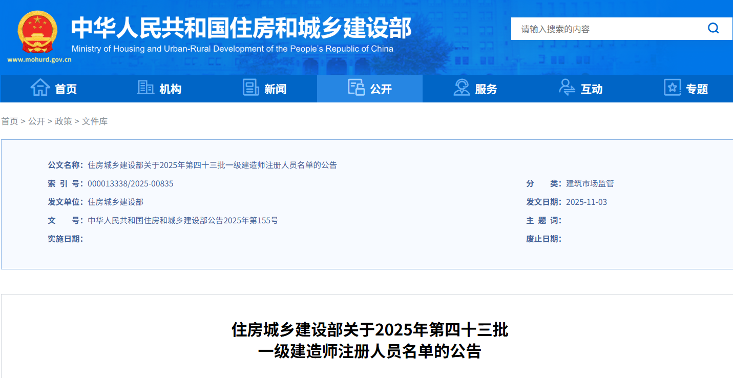 住房城乡建设部关于2025年第四十三批一级建造师注册人员名单的公告发布,18809名申请一级建造师注册的人员符合注册条件,准予注册。