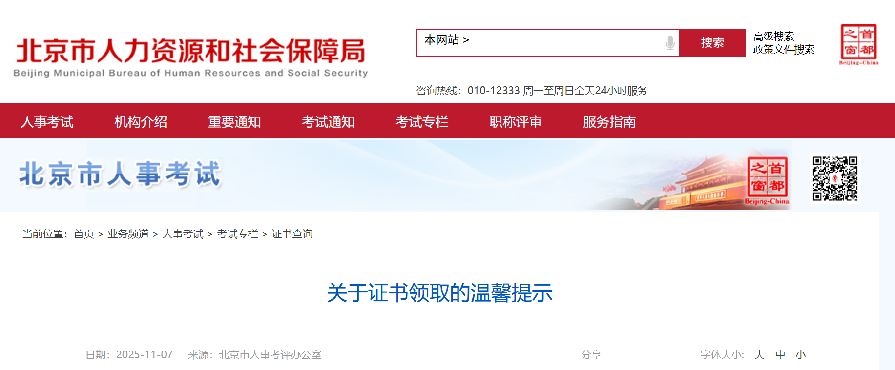 北京市人社局于2025年11月7日发布通知,提醒2025年一级建造师考试合格人员,应及时领取纸质证书。根据规定,逾期未领的证书将由发放机构代为保管,保管期限为考试结束日起5年。