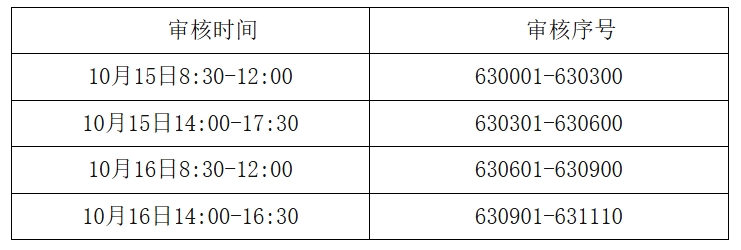 为提高审核效率,本次审核按照“审核序号”分批次进行(“审核序号”为资格复核人员名单第一列),请考生熟记本人审核序号,并在规定审核时间内完成审核,不得提前也不得推后。