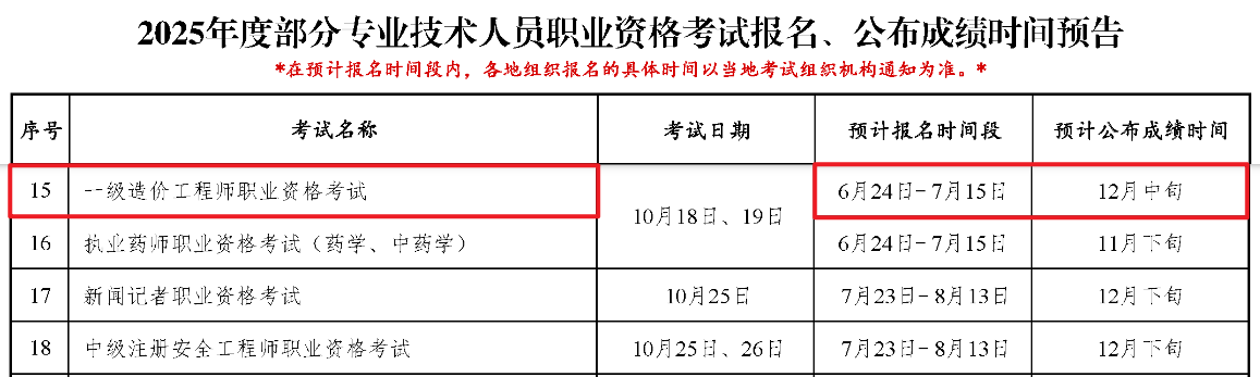根据中国人事考试网发布的《2025年度专业技术人员职业资格考试重要事项提示》可知,2025年一级造价师考试将于6月24日至7月15日报名,各地报名时间有所差异。