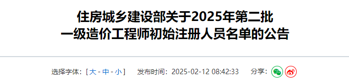 2025年2月12日,中华人民共和国住房和城乡建设部发布了《关于2025年第二批一级造价工程师初始注册人员名单的公告》,其中明确共有794人符合一级造价师初始注册条件,并对相关人员信息予以公示。