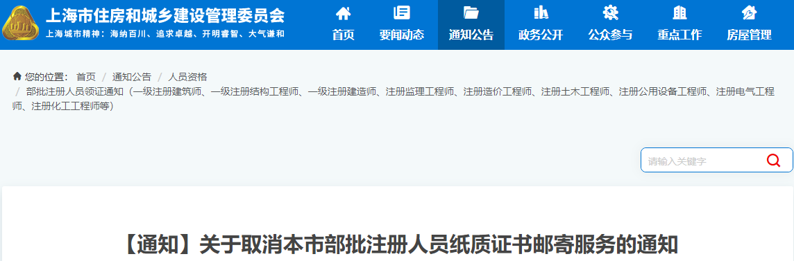 上海市取消一级造价师注册人员纸质证书邮寄服务通知原文如下: