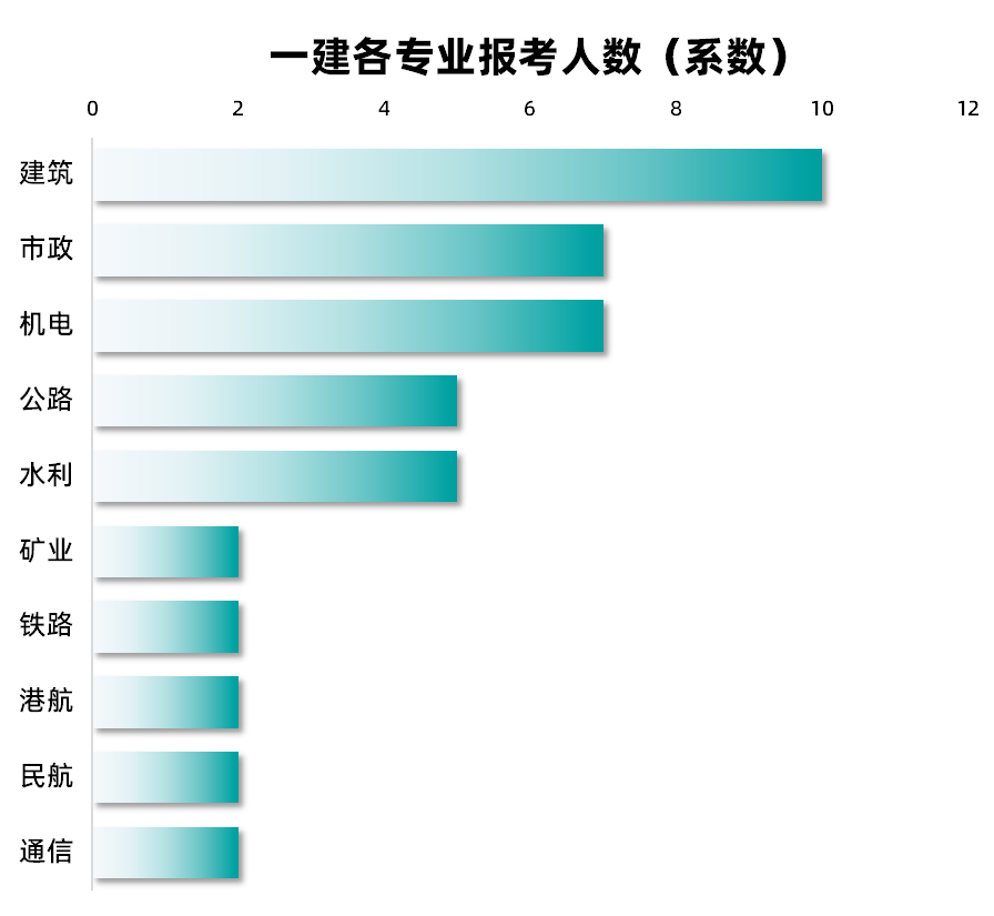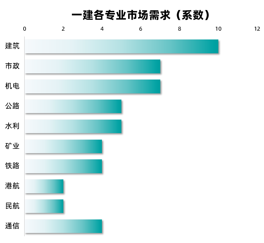 一建各专业市场需求量排名(从高到低):建筑>市政>机电>公路>水利>矿业>铁路>通信>港口>民航。