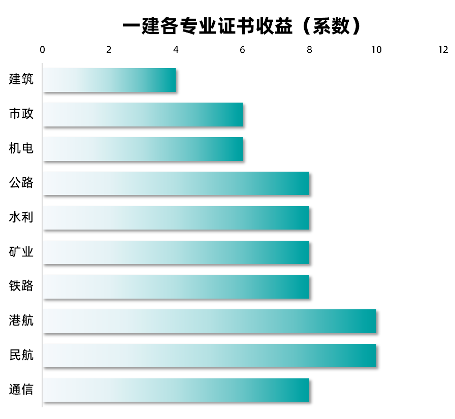 一建各专业证书收益值排名(从高到低):港口>民航>通信>铁路>矿业>水利>公路>机电>市政>建筑。