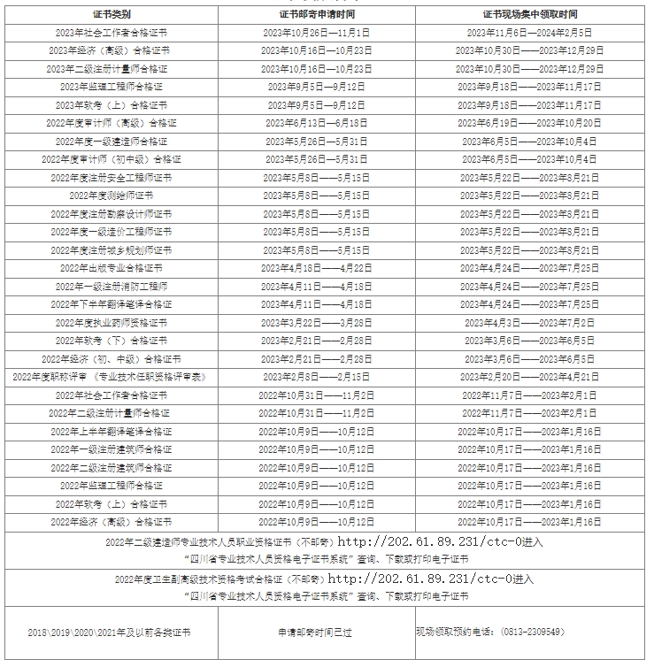 自贡人事考试评价中心近日更新《证书发放通知》,2023年自贡社会工作师证书于10月26日-11月1日申请邮寄,于2023年11月6日-2024年2月5日进行现场集中领取。