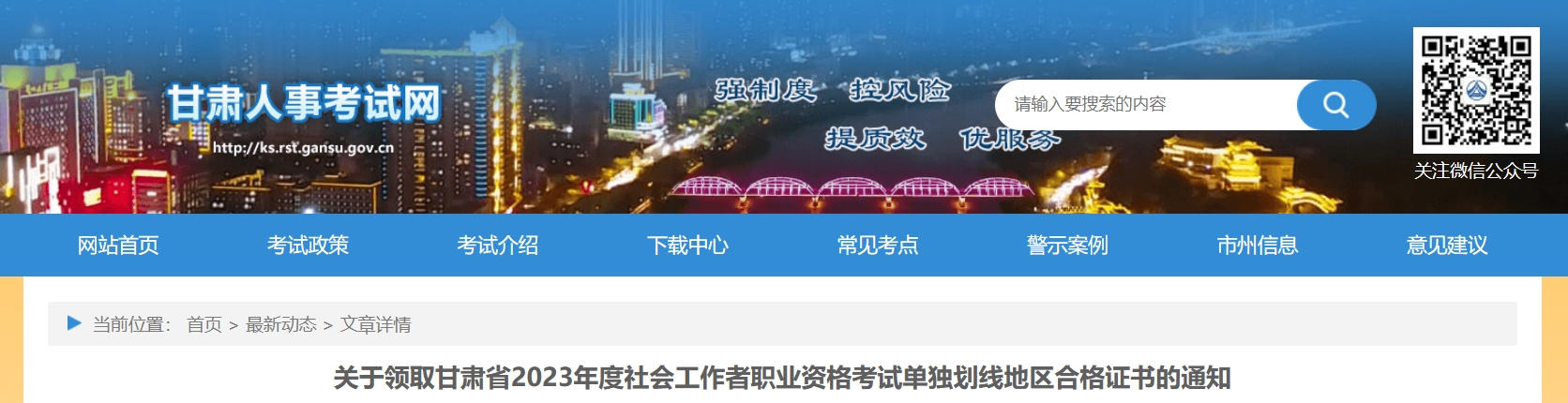 甘肃人事考试网近日发布《关于领取甘肃省2023年度社会工作者职业资格考试单独划线地区合格证书的通知》,甘肃省2023年度社会工作者职业资格考试单独划线地区合格证书从2023年12月20日起开始发放。