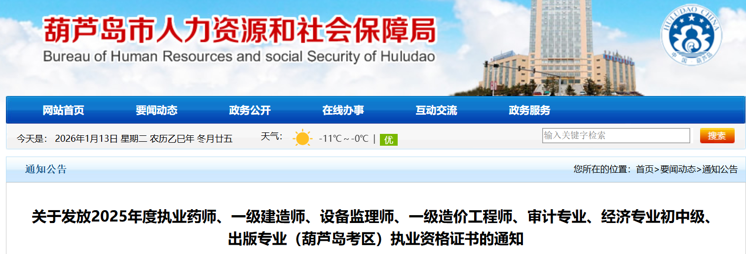 葫芦岛市定于2026年1月13日开始发放2025年度执业药师、一级建造师、设备监理师、一级造价工程师、审计专业、经济初中级、出版专业(葫芦岛考区)职业资格证书,为方便考生领取现将有关工作安排如下: